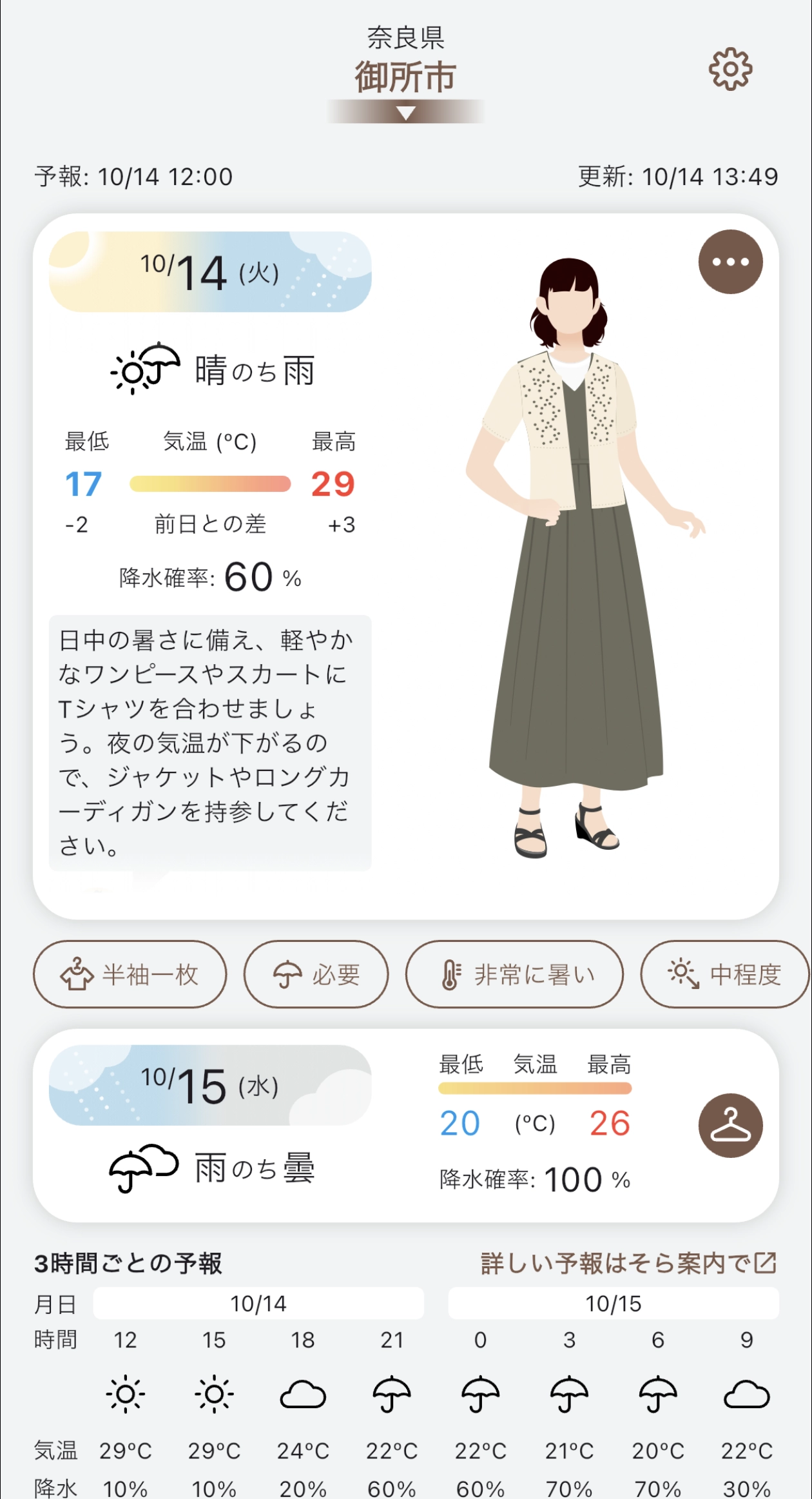 そらコーデアプリも天気の予報データは、そら案内と同様に日本気象協会様のデータで構成されています。